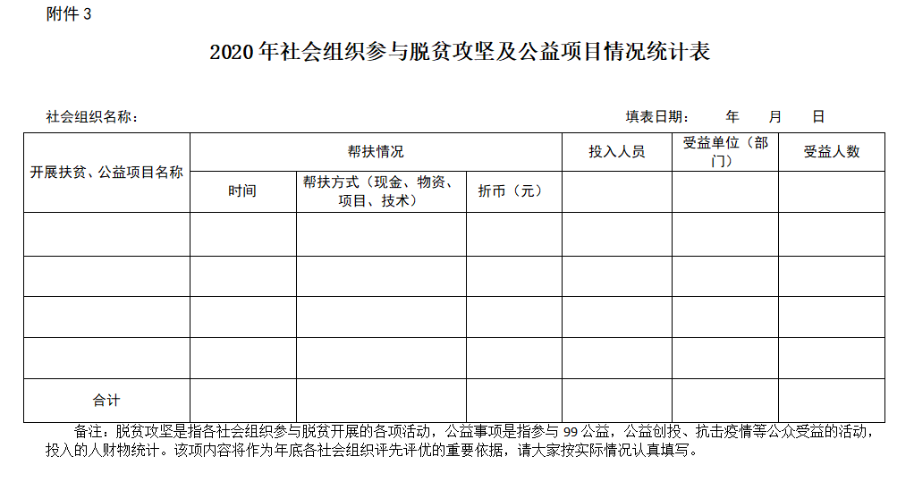 4.请各社会组织认真填写《2020年社会组织参与脱贫攻坚及公益项目情况统计表》(附件3),该项内容将作为年底各社会组织评先评优的重要依据。