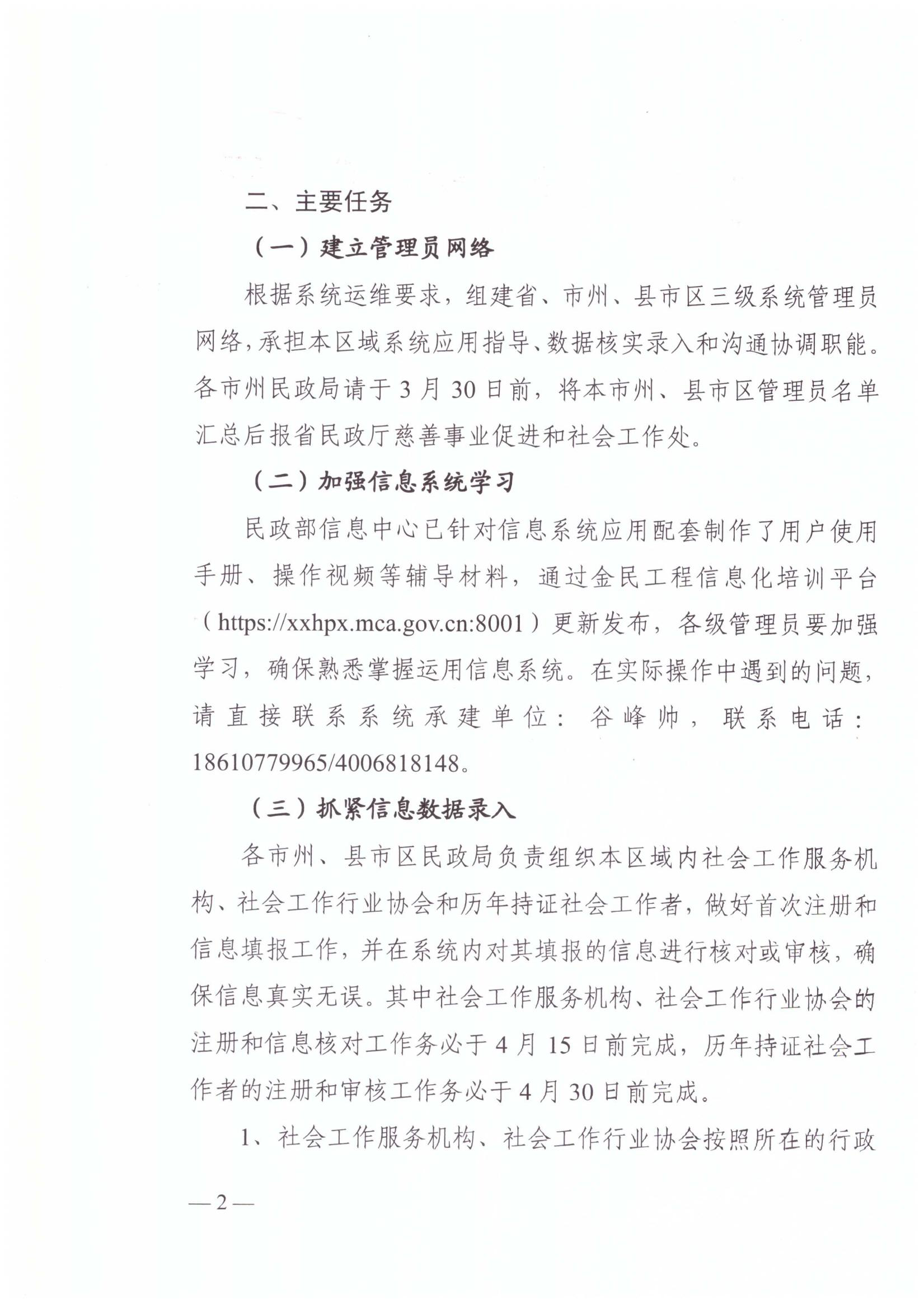 根据《民政部办公厅关于启用全国社会工作信息系统的通知》(民办函〔2021〕4号)要求,省民政厅下发了《关于推广应用全国社会工作信息系统的通知》,现转发给你们。请于4月12日前完成社会工作服务机构、社会工作行业协会的注册和信息审核工作,4月28日前完成历年持证社会工作者的注册和审核工作,请各县市区民政局于4月底前将工作开展情况上报给市局慈善事业促进和社会工作科。