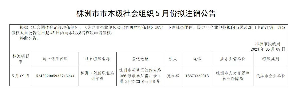 株洲市市本级社会组织5月份拟注销公告