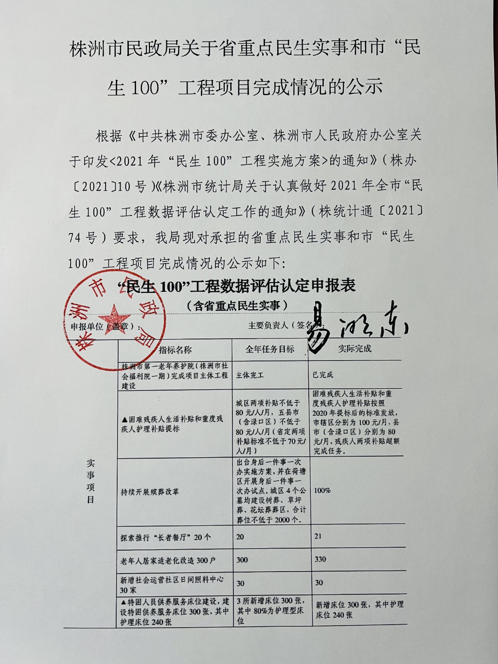 株洲市民政局重点民生实事数据评估认定申报表