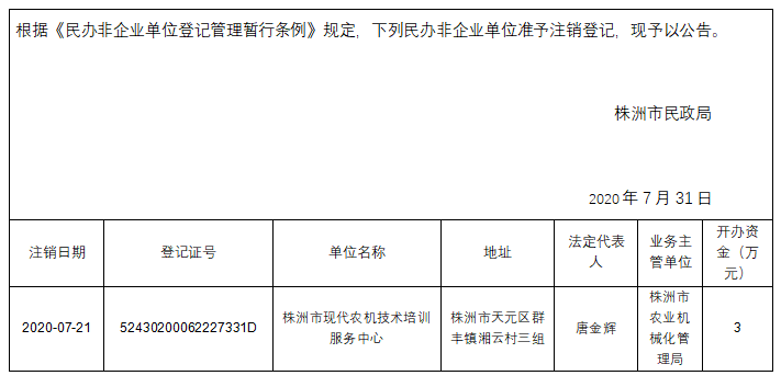 株洲市市本级民办非企业单位7月份注销登记公告