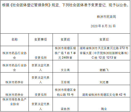 株洲市市本级社会团体8月份变更登记公告