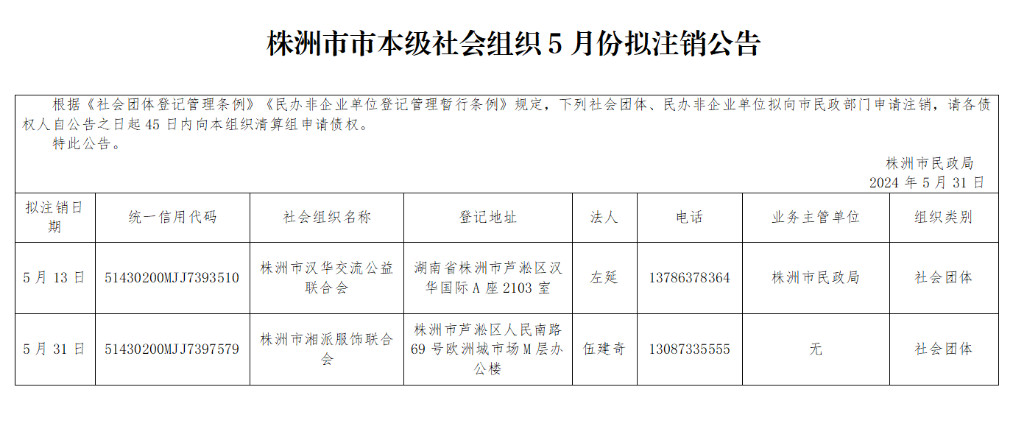 株洲市市本级社会组织5月份拟注销公告