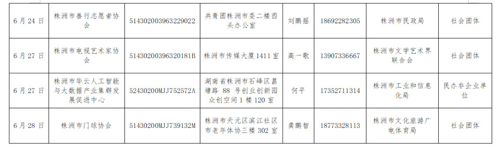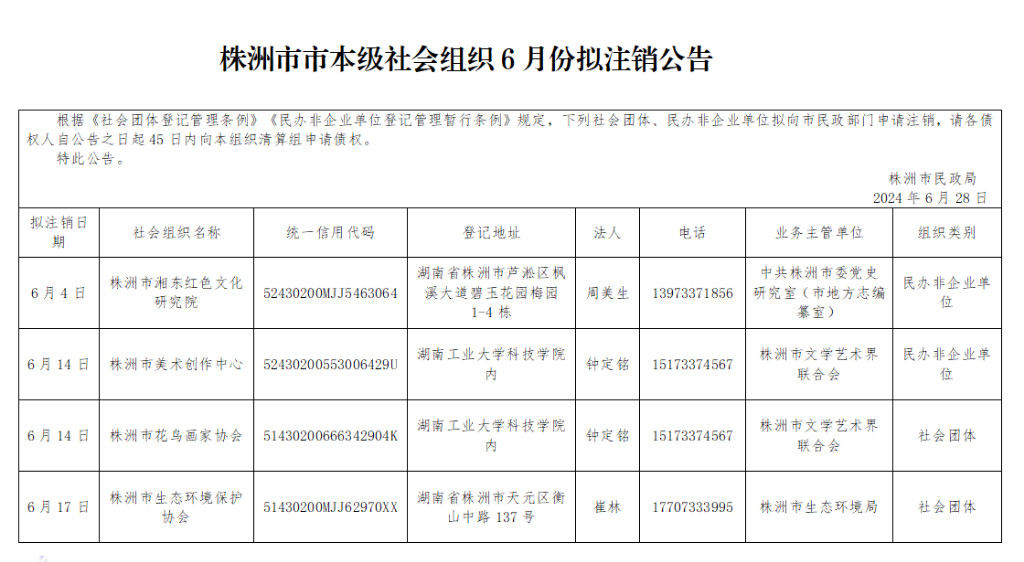 株洲市市本级社会组织6月份拟注销公告