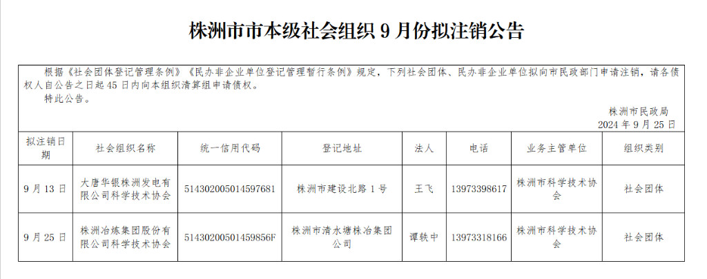 株洲市本级社会组织9月份拟注销公告