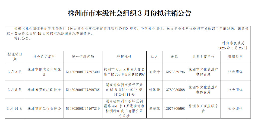 株洲市市本级社会组织3月份拟注销公告