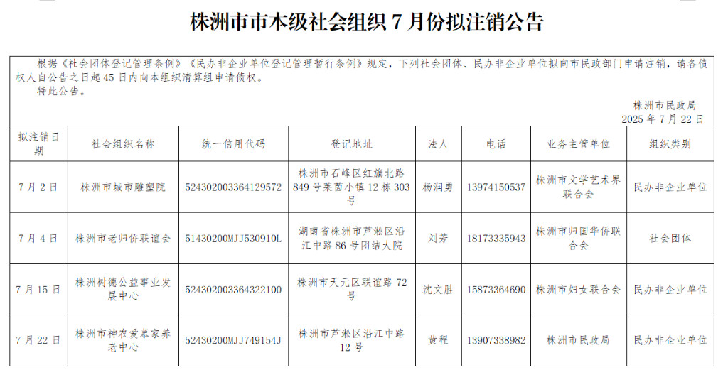 株洲市市本级社会组织7月份拟注销公告